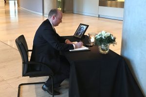 Matthias Hauer MdB schreibt in das im Reichstagsgebäude ausliegende Kondolenzbuch für den verstorbenen Bundestagsabgeordneten und Vizepräsidenten des Deutschen Bundestages, Peter Hintze.