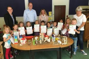Zum Abschluss des Projekts überreichte Matthias Hauer den Kindern ein Forscher-Diplom. Das Projekt haben die Kinder- und Jugendbeauftragte im Stadtbezirk VIII, Tanja Sager (l.), Kita-Leiterin Nicole Weber und Kinderpflegerin Carola Schrade (r.) begleitet.