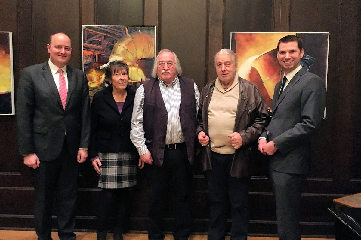 Der Künstler Tilo Erdmann (2.v.r.) bei der Vernissage mit Matthias Hauer, Beate Schick, Günter Sponheuer und Fabian Schrumpf (v.l.)