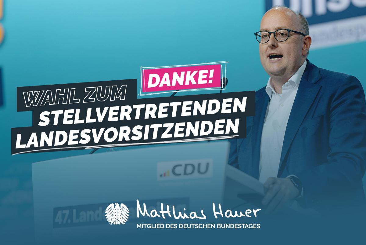 Der Landesparteitag der CDU Nordrhein-Westfalen wählte Matthias Hauer MdB zu einem der sechs stellvertretenden Landesvorsitzenden. Hendrik Wüst wurde zuvor mit 98 Prozent im Amt des Landesvorsitzenden bestätigt.